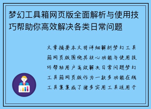 文章摘要:本文将详细解析梦幻工具箱网页版,围绕其核心功能与使用技巧,帮助用户高效解决日常问题。梦幻工具箱网页版作为一款多功能在线工具集,集成了诸多实用工具,适用于不同场景,如文本处理、图片优化、计算工具、在线翻译等。文章从四个方面进行全面介绍:首先是梦幻工具箱网页版的核心功能与特点,其次是如何高效利用该工具集提高工作效率,再者探讨其应用场景,最后分析使用技巧,帮助用户最大化工具效用。通过本文的阅读,您将能够更加熟练地掌握梦幻工具箱网页版,从而节省时间,提升工作和生活的质量。